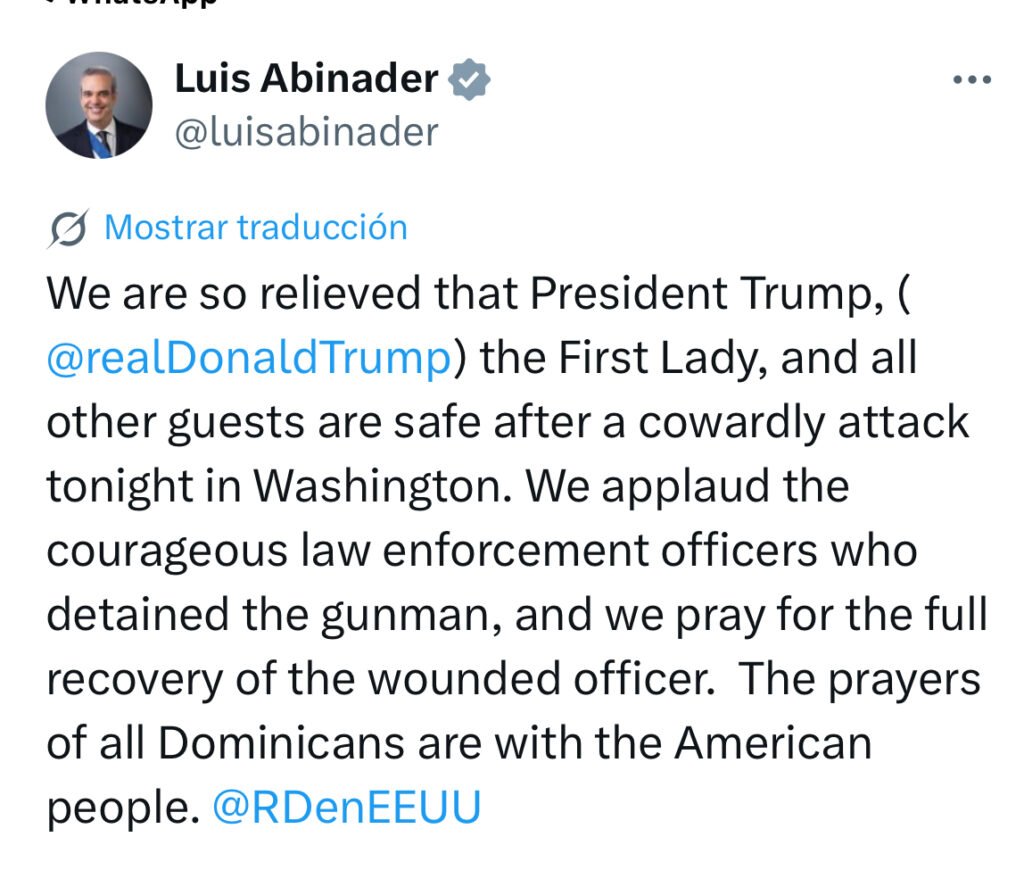 Santo Domingo, RD.-– El presidente de la República, Luis Abinader, manifestó su alivio luego de que el presidente de Estados Unidos, Donald Trump, la primera dama Melania Trump y otros invitados resultaran ilesos tras un ataque ocurrido la anoche en Washington.