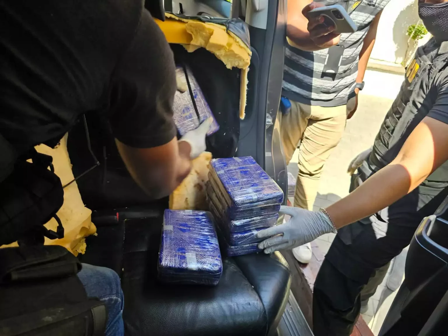 Posteriormente, por instrucciones de los fiscales actuantes y por razones de seguridad, el detenido y el vehículo, fueron trasladados a la sede central de la DNCD, donde se realizó una inspección más rigurosa, encontrando encaletados en el interior de los asientos delanteros y traseros de la jeepeta, un total de 35 paquetes de una sustancia que se presume es cocaína.
