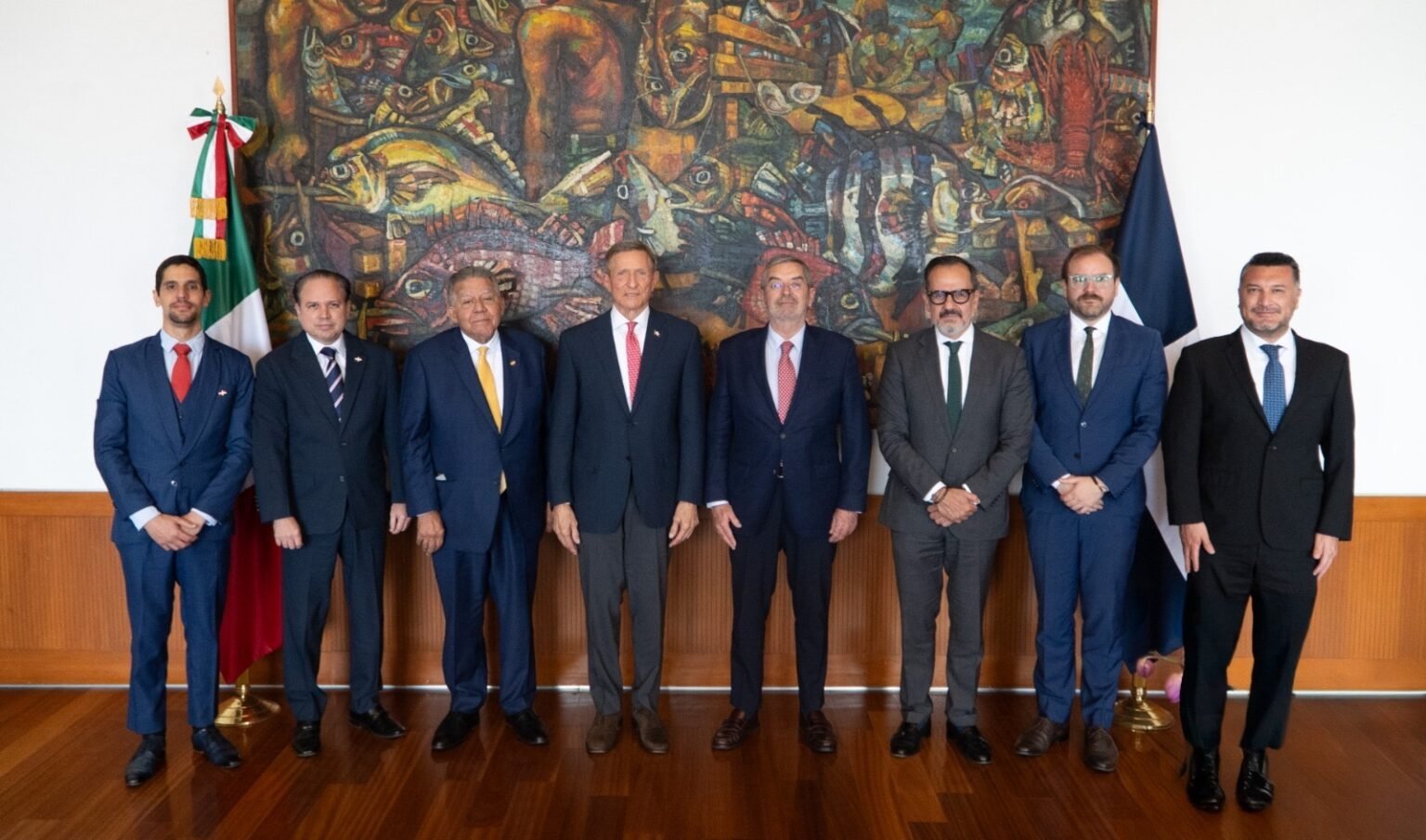 Durante este viaje, el ministro Álvarez estuvo acompañado de una delegación compuesta por el viceministro Asuntos Económicos y Cooperación Internacional del MIREX, Hugo Rivera; el embajador dominicano en México, Juan Bolívar Díaz; y el director de Estudios y Análisis Estratégicos del MIREX, Anselmo Muñiz.