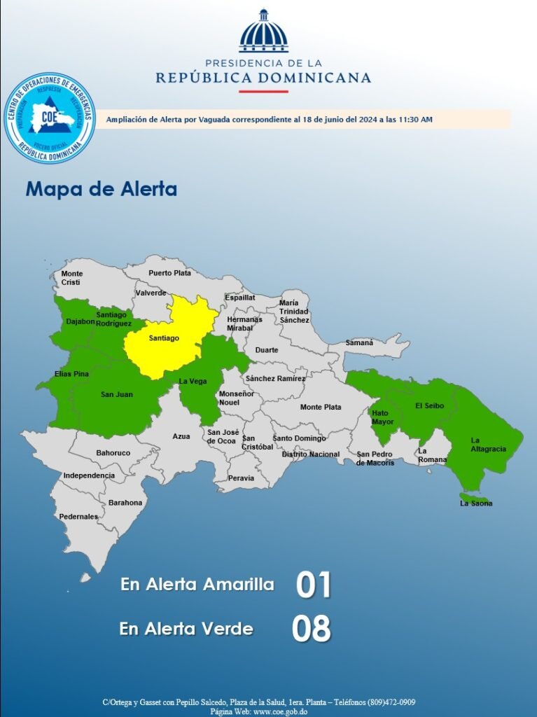 En alerta amarilla está: Santiago, mientras que en alerta verde se encuentra: Santiago Rodríguez, La Vega, Dajabón, El Seibo, Elías Piña, San Juan, La Altagracia y Hato Mayor.