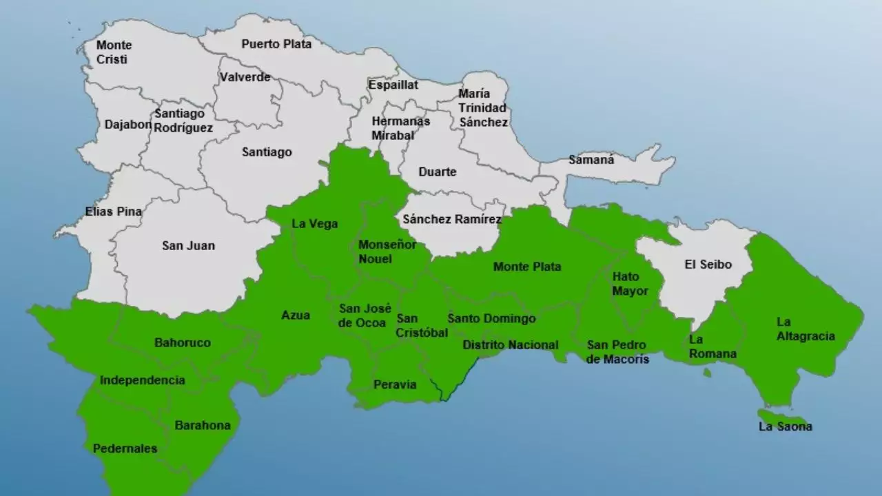 Las provincias en alerta verde son Peravia, Independencia, Azua, Pedernales, provincia Santo Domingo, La Vega, San Cristóbal, Hato Mayor, Distrito Nacional y Monseñor Nouel.