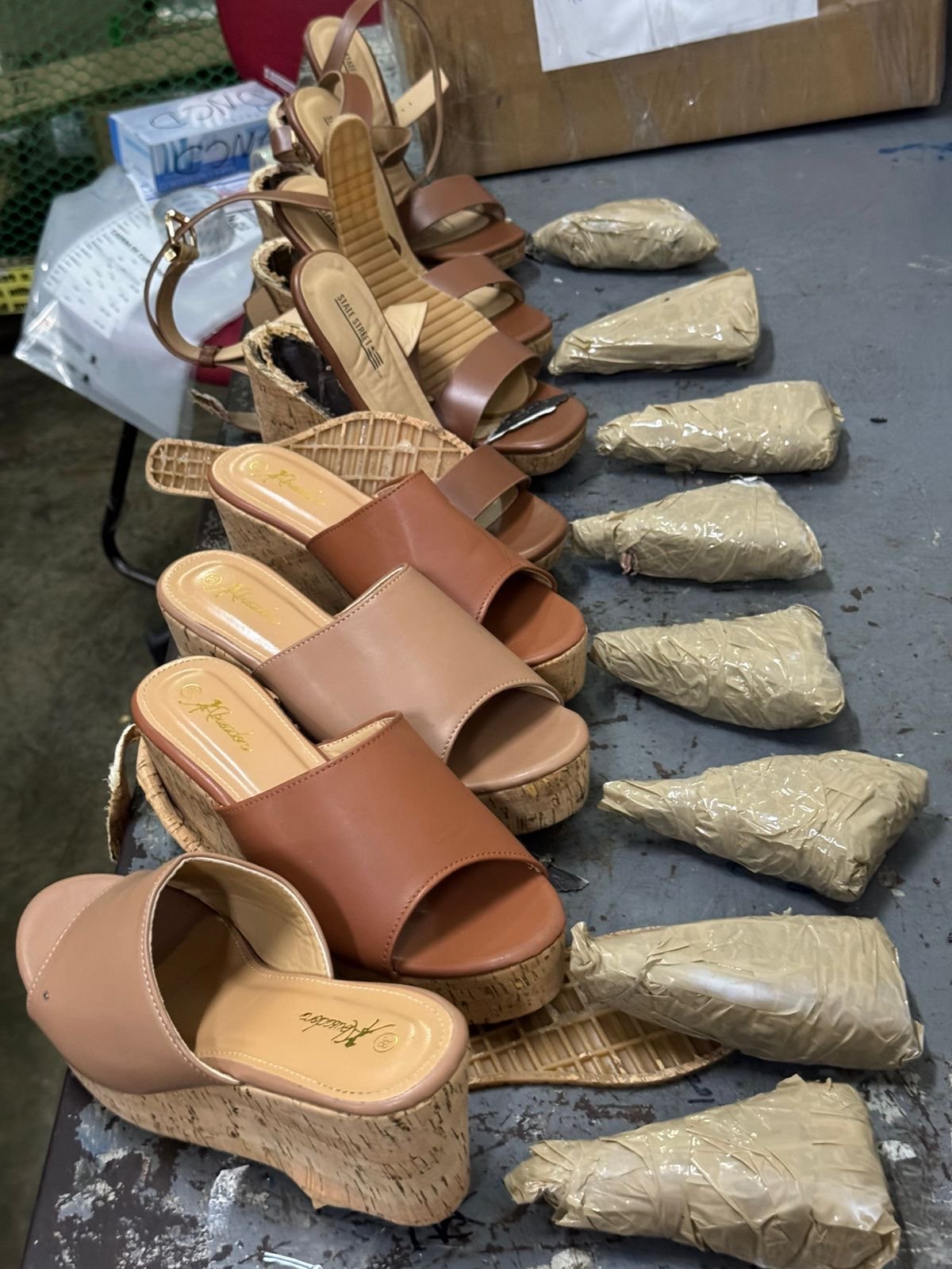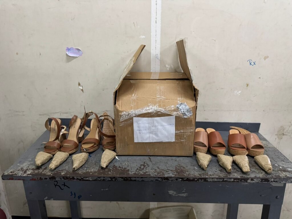 Coordinados por el fiscal, los agentes procedieron a una revisión minuciosa y hallaron ocho láminas impregnadas de cocaína, ocultas de manera ingeniosa dentro de las plataformas de cuatro pares de zapatillas. El peso de la sustancia supera un kilogramo.
