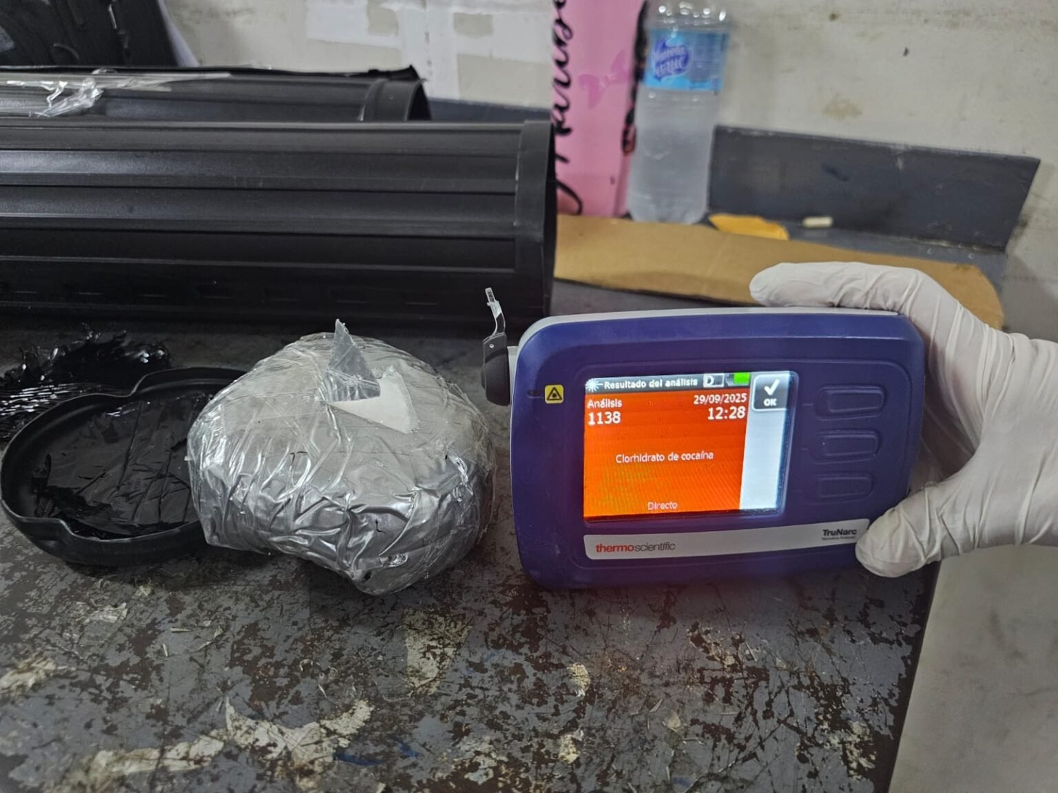 En un segundo operativo, realizado en el Inposdom, las unidades de la DNCD, apoyados por inspectores, intervinieron un paquete, donde se ocupó un portaplanos, conteniendo dentro (oculta) una porción de cocaína, con un peso preliminar de 385 gramos.