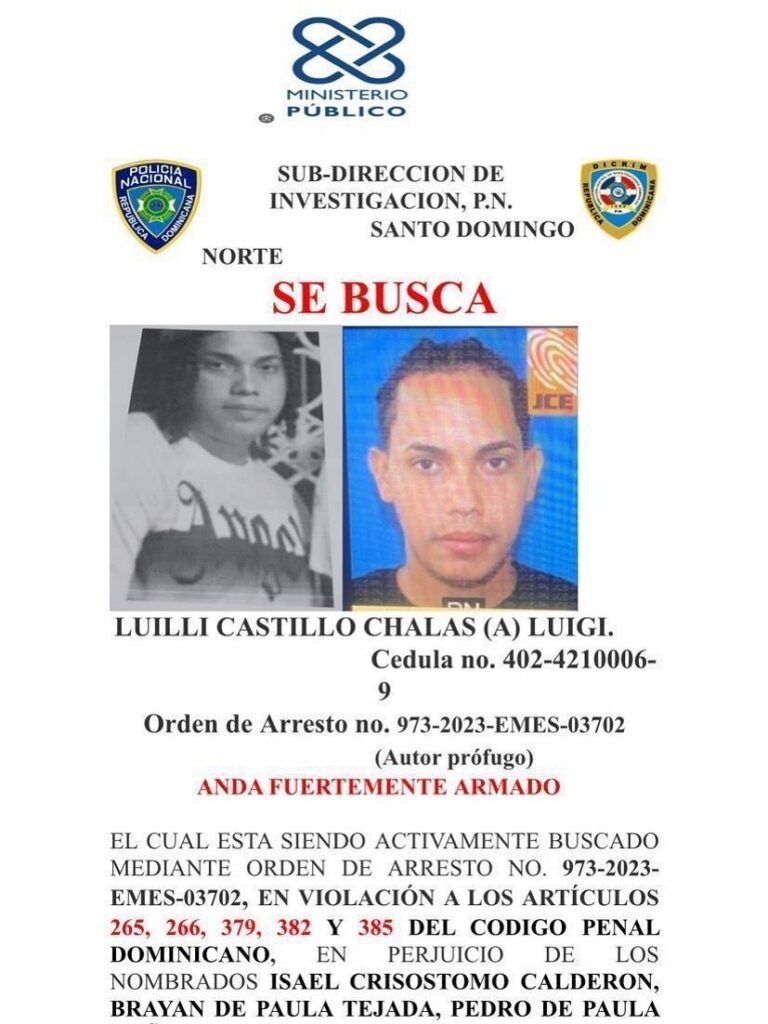 Santo Domingo Norte, RD.-La Policía Nacional, a través de la Subdirección Central de Investigación (DICRIM), activa la búsqueda de Luilli Castillo Chalas (a) “Luigi”, peligroso delincuente contra quien pesa la orden de arresto No. 973-2023-EMES-03702, por la comisión de múltiples delitos en presunta violación a los artículos 265, 266, 379, 382 y 385 del Código Penal Dominicano, en perjuicio de varios ciudadanos.