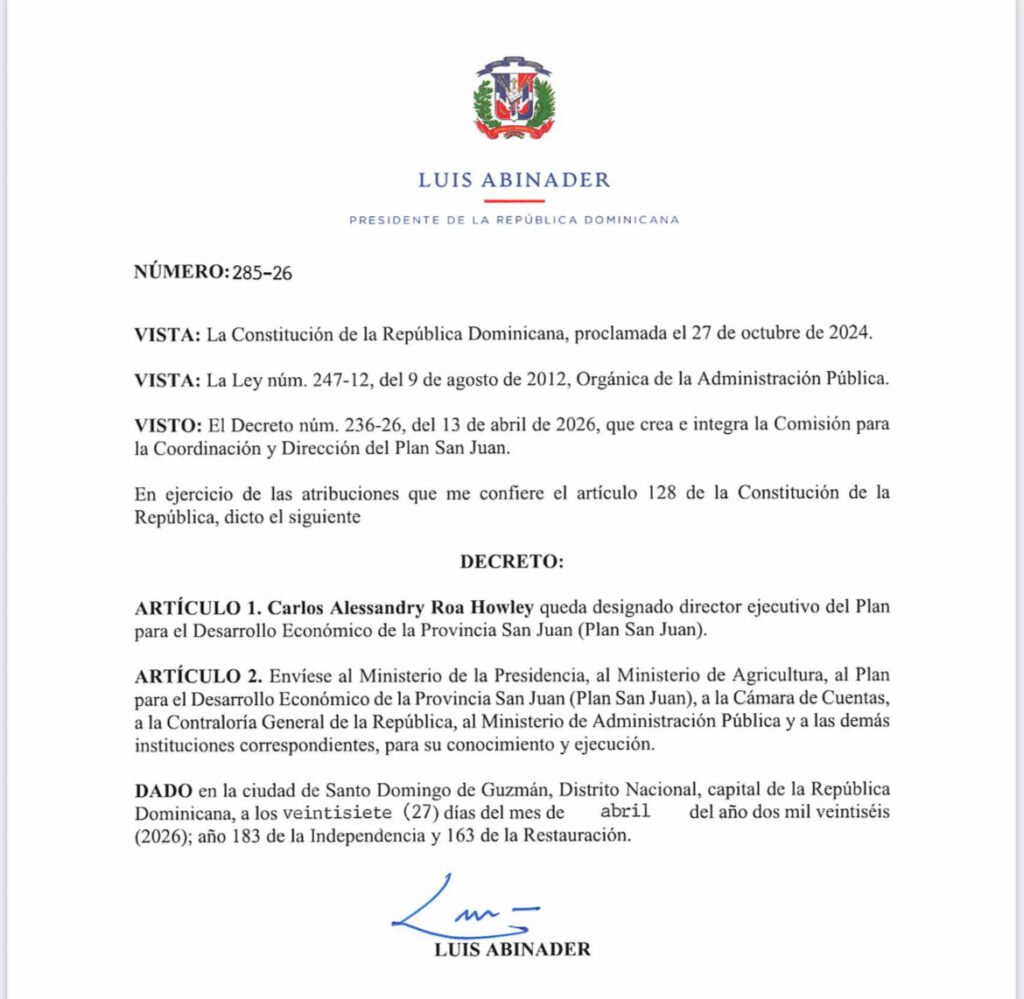 Santo Domingo, RD./El presidente Luis Abinader emitió los decretos 236-26 y 285-26 que tienen el propósito de dar continuidad a las acciones para el desarrollo integral en los ámbitos económico y social de los residentes y comunidades de la provincia San Juan.