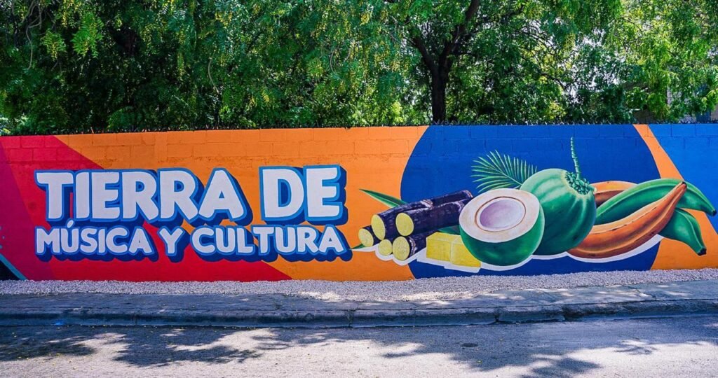 Resalta, asimismo, la producción agrícola, representada por cultivos como el coco, la caña y el plátano, también ocupa un lugar central en el mural, que integra arte, historia y tradición en una narrativa visual diseñada para elevar el orgullo local.
