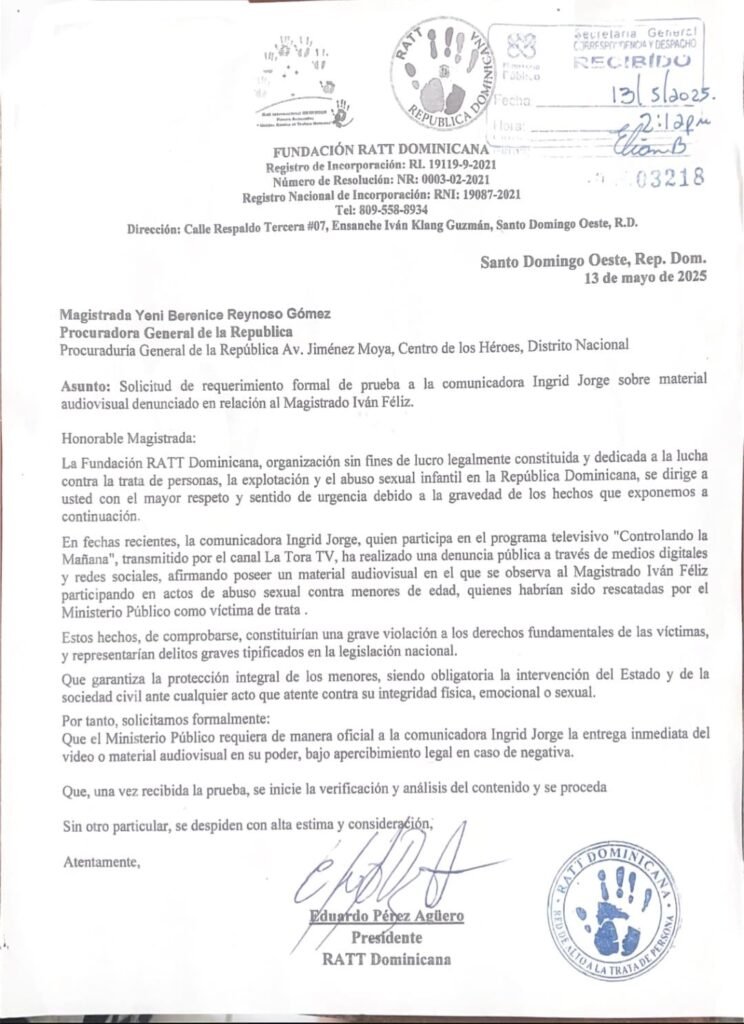 Santo Domingo, RD.-La Fundación Red al Alto a la Trata y Tráfico de Personas (RATT), solicitó vía comunicación formal a la magistrada Yeni Berenice Reynoso, requerir a la comunicadora Ingrid Jorge las pruebas audiovisuales que según esta posee en contra del magistrado de la Procuraduría Especializada contra los Delitos Electorales Ivan Féliz, abusando sexualmente de niñas en calidad de víctimas de trata y tráfico, quienes habrían sido rescatadas por el Ministerio Público.