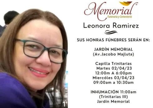 Los restos de la periodista Leonora Ramírez serán sepultados a las 11: 00 de la mañana de este miércoles en el Cementerio Jardín Memorial, ubicado en la avenida Jacobo Majluta, Santo Domingo.